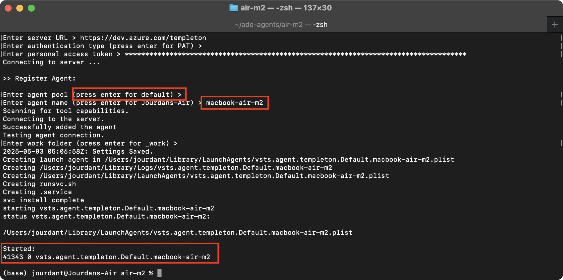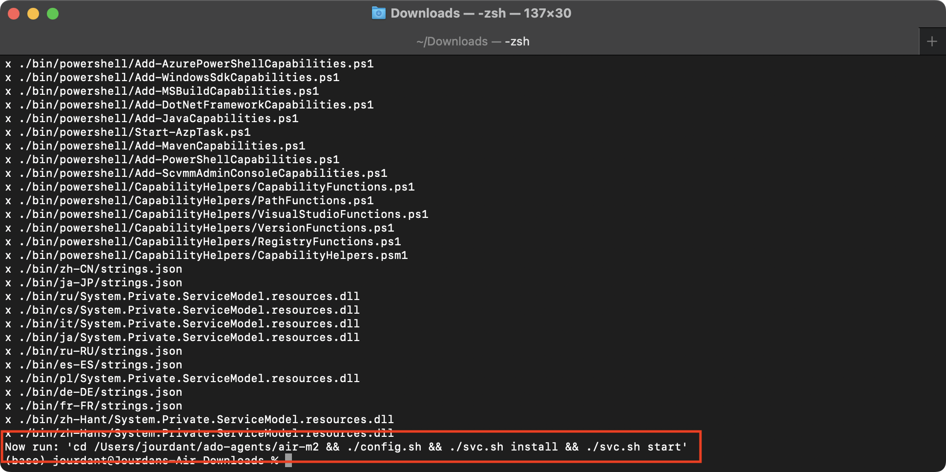 If you don't want to chmod +x the script, you can also execute as a one-off zsh ./ado-agent.sh. After running the script, you should see a message to run a command to configure the agent like below: