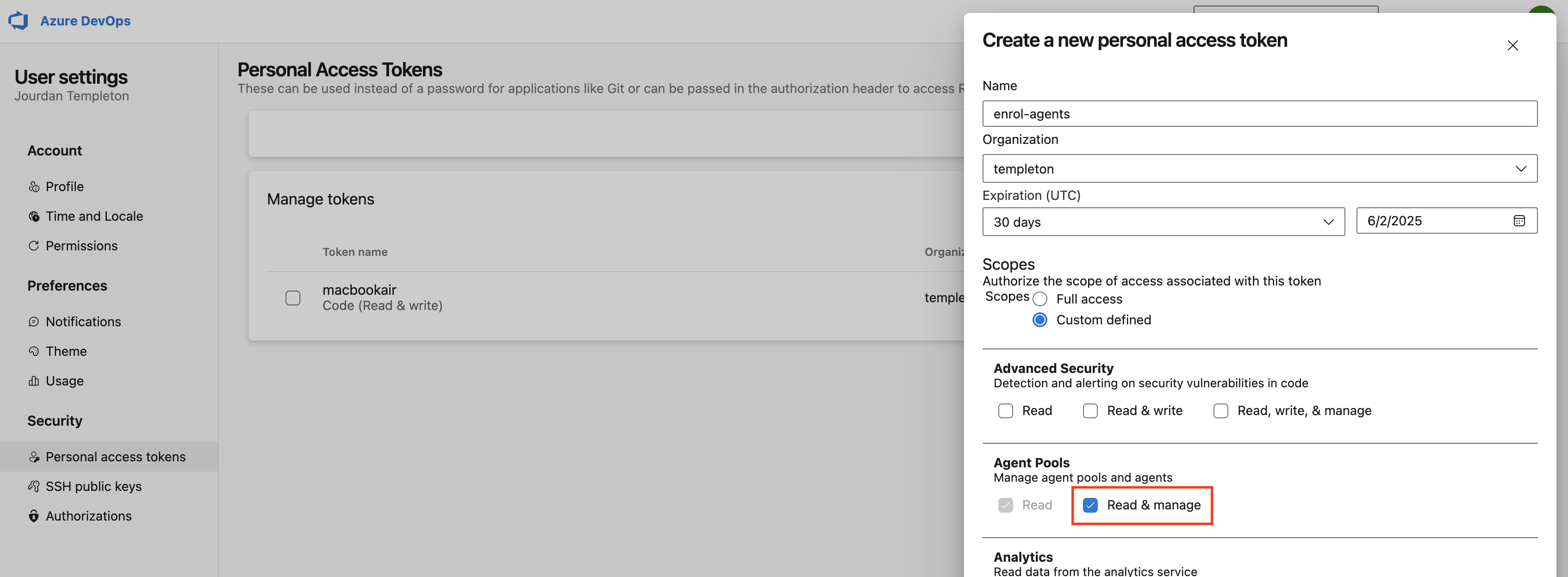 Give it a name and a short expiry is fine, this PAT is only required to enrol the build agent. After this process, the PAT is not required for the on-going running of the build agent.