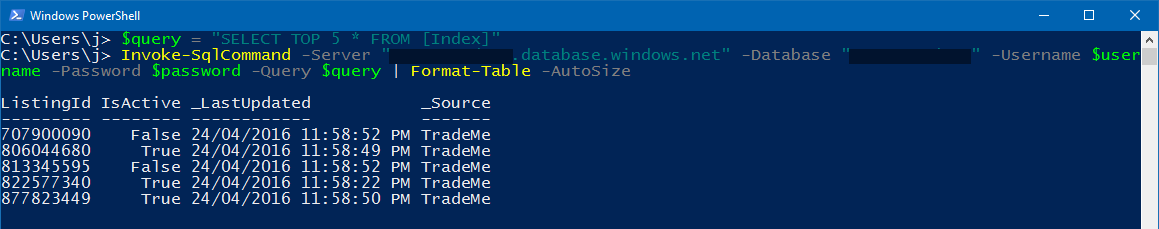 Invoke-SqlCommand -Server $server -Database $db -Username $user -Password $pass -Query $sql | Format-Table
